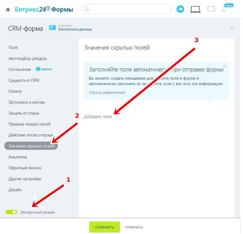 6 Далее перейдите на вкладку Значения скрытых полей (2). Затем нажмите Добавить поле (3).