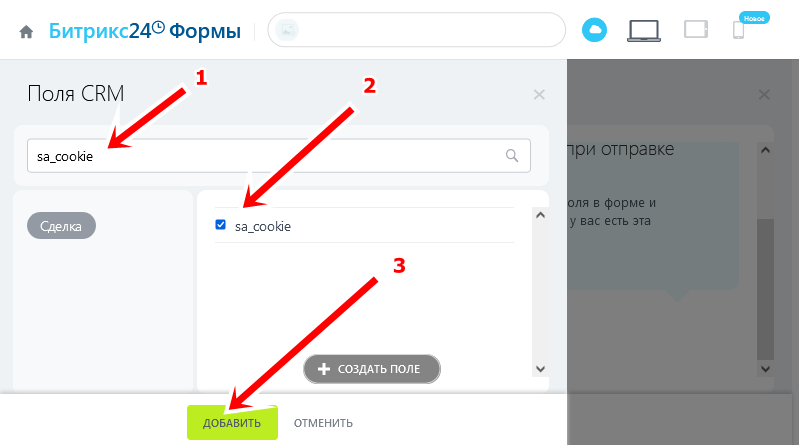 ⚠️ Важно! Эти поля нужно выбрать из меню и нажать Добавить(3), а не через опцию «Создать поле».