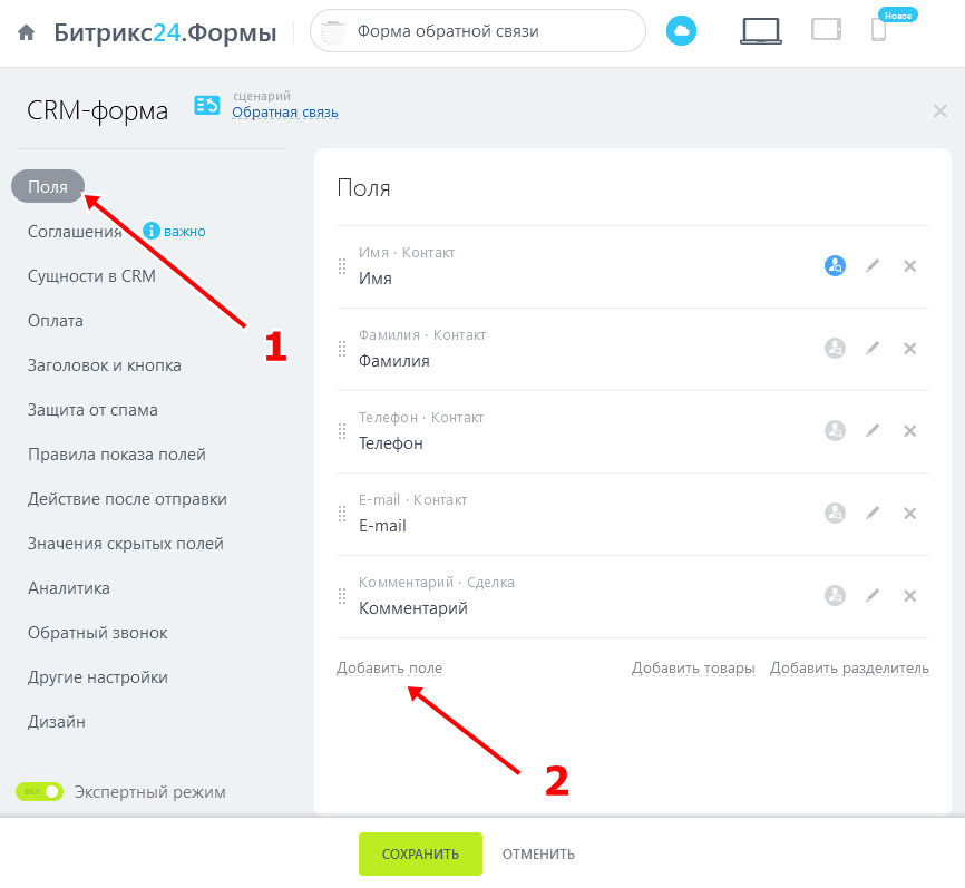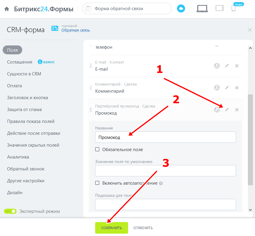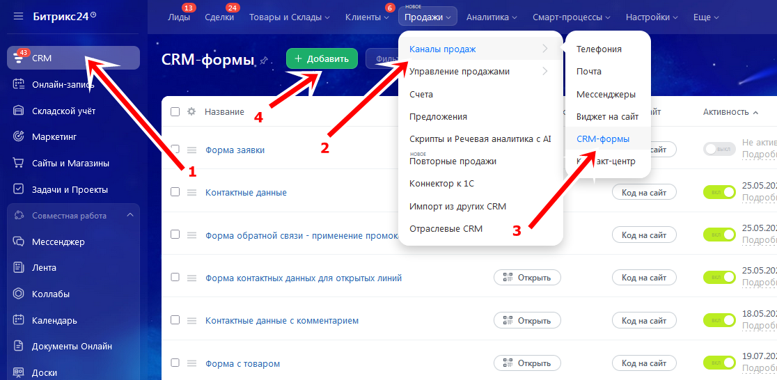 CRM → Продажи → Каналы продаж(2) → CRM-формы(3):