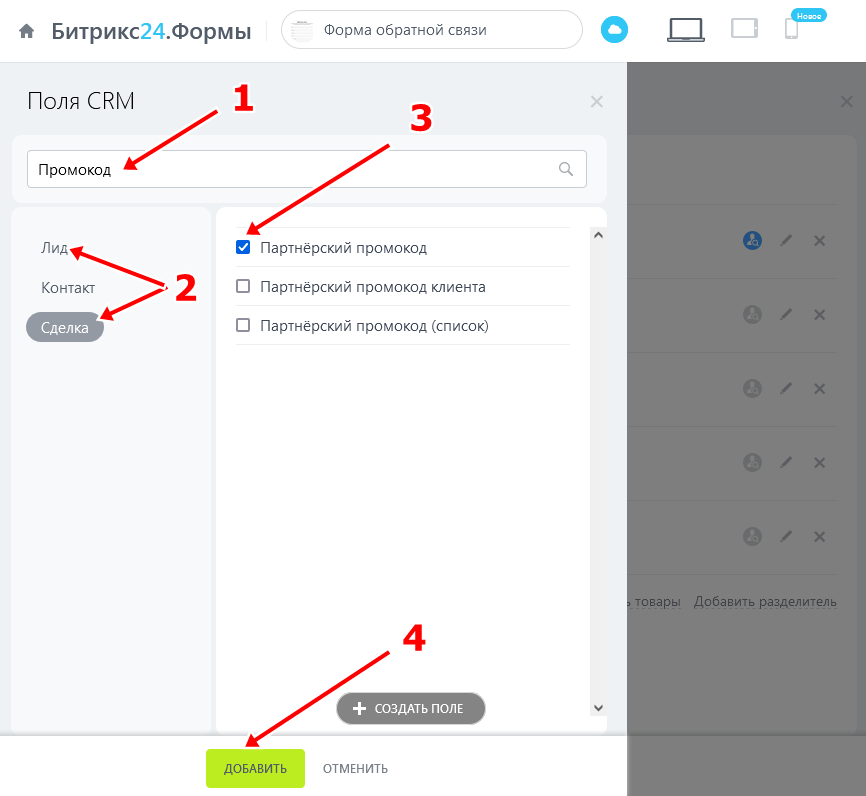 7 В открывшемся окне, в поиске наберите Промокод (1). В зависимости от того, создаётся сделка или лид по результатам заполнения формы, выберите соответствующую вкладку в левом меню (2). Отметьте найденное поле Партнёрский промокод галочкой (3) и нажмите Добавить (4)