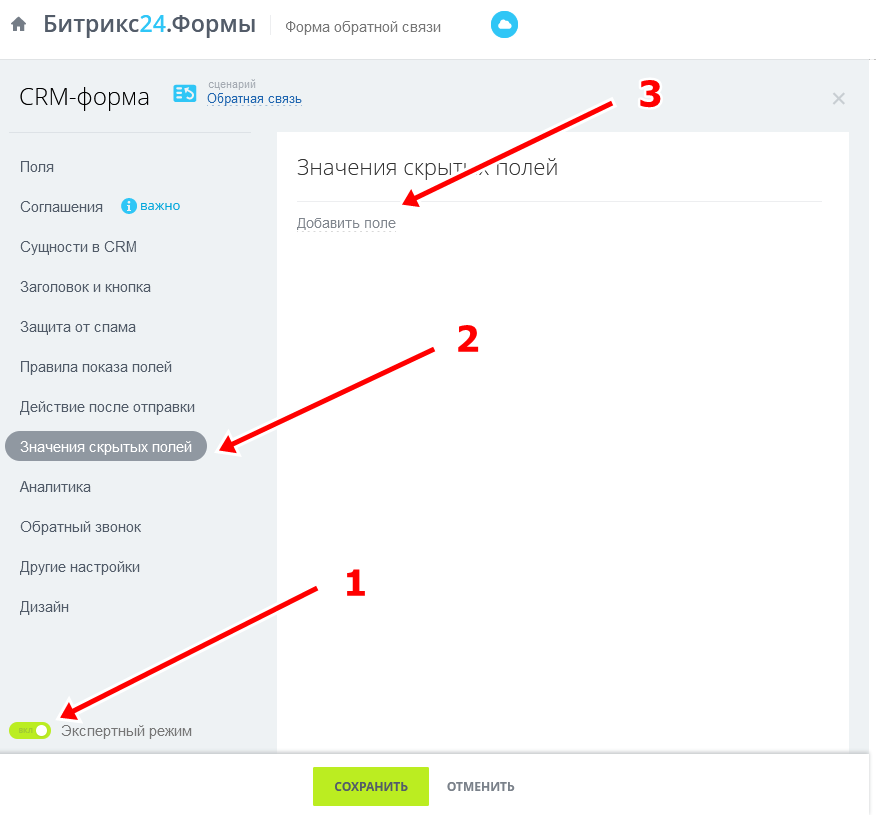 3 Нажмите Включить экспертный режим (1) и перейдите на вкладку Значения скрытых полей (2). Затем нажмите Добавить поле (3).