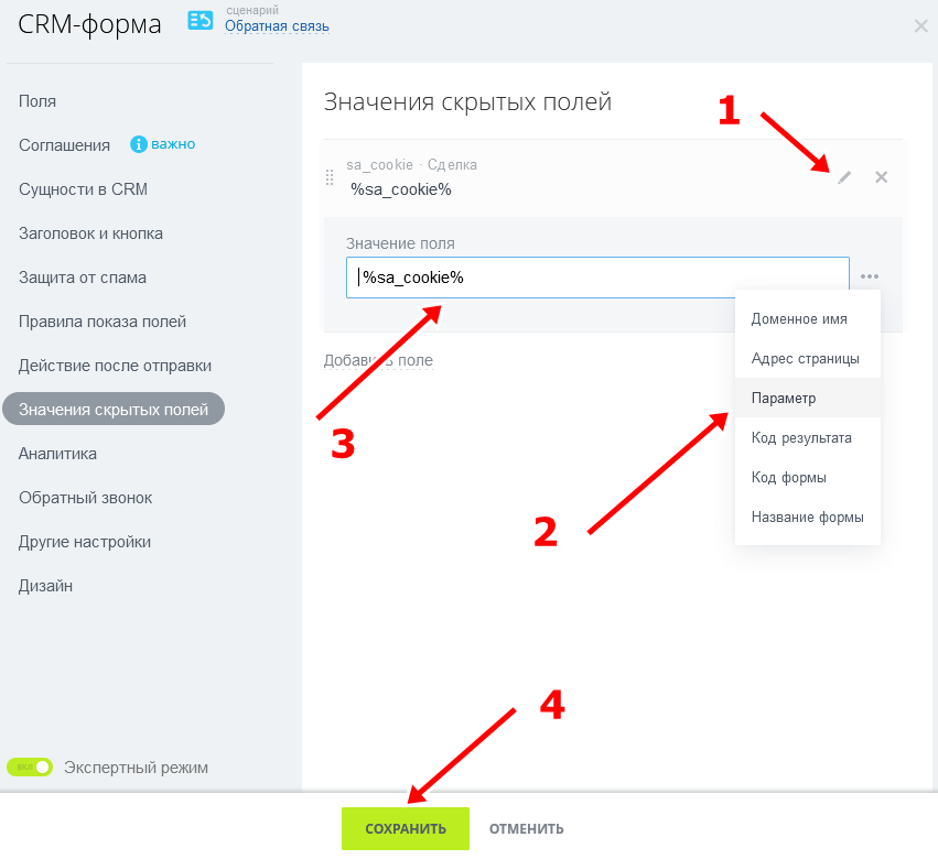 5 Нажмите на значок редактирования поля (1), затем в выпадающем меню Значение поля, выберете Параметр (2) и назовите его %sa_cookie% (3). Затем нажмите кнопку Сохранить (4).