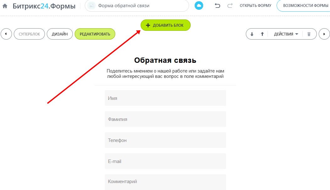9 Далее необходимо добавить на форму новый блок типа HTML код. Для этого в режиме редактирования формы, нажмите на кнопку Добавить блок.